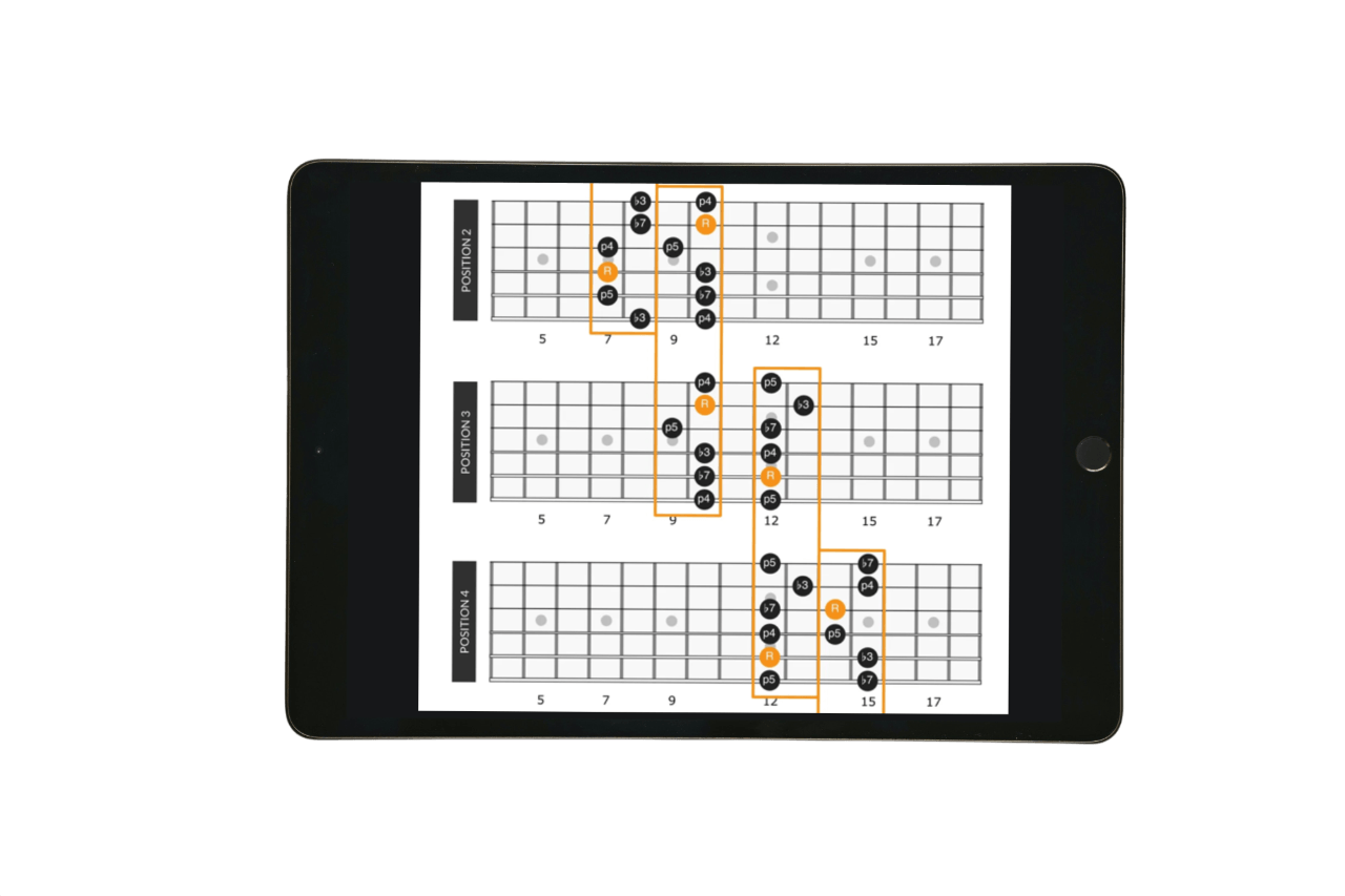 Mapas visuales del diapasón diseñados para pantalla: colores que destacan las notas clave, gráficos que hacen click al instante. Lo digital te deja verlo grande, claro, y tenerlo siempre sincronizado en todos tus dispositivos mientras practicas.